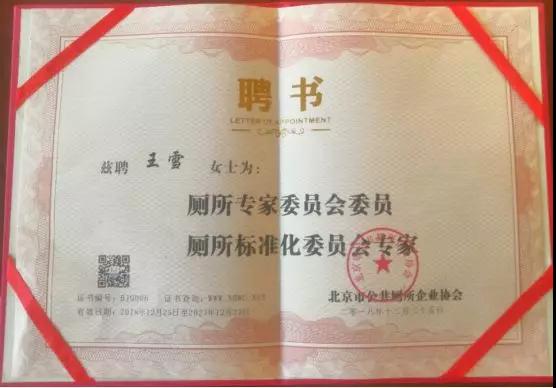 雨施捷受聘獲得廁所委員會和廁所標準化委員會證書