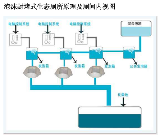 發泡劑經混合后,進入發泡器,通過PLC控制系統,使廁具內的泡沫保持一定的量,排泄物經過排水管道進入儲糞箱。